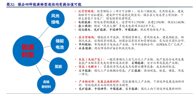 (1)風(fēng)光綠電。風(fēng)光綠電轉(zhuǎn)型為運(yùn)營型轉(zhuǎn)型路線,是煤企能源轉(zhuǎn)型的主要路徑之一,該路徑具有投資額較小、項(xiàng)目可分解、技術(shù)門檻相對(duì)較低、風(fēng)險(xiǎn)成本低等特點(diǎn)。風(fēng)光綠電建成期短并可分批建設(shè),建成即能形成穩(wěn)定的現(xiàn)金流。由于大部分煤企具有坑口火電廠,煤炭下游客戶主要為電廠,煤企具有一定的電力運(yùn)營能力,風(fēng)光綠電轉(zhuǎn)型具有明顯優(yōu)勢(shì),是煤企轉(zhuǎn)型初期的主要路徑。電投能源:上市煤企中風(fēng)光綠電運(yùn)營規(guī)模最大,運(yùn)營項(xiàng)目1.55GW,在建2.35GW,規(guī)劃4.14GW。盤江股份:規(guī)劃發(fā)展風(fēng)電、光伏、火電、抽水蓄能項(xiàng)目612萬千瓦,“風(fēng)光火儲(chǔ)”多能互補(bǔ),前景廣闊。靖遠(yuǎn)煤電、兗礦能源、中國神華、中煤能源:規(guī)劃布局綠電產(chǎn)業(yè)。
