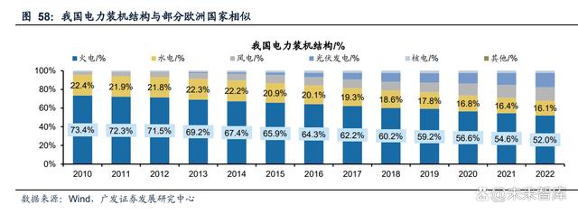部分歐洲國家與我國電力結(jié)構(gòu)相似,能源轉(zhuǎn)型過程值得借鑒。從我國電力裝機結(jié)構(gòu)來看,過去我國以傳統(tǒng)電源火電、水電為主,2010年兩者裝機占比96%,風(fēng)光等可 再生能源逐漸成為發(fā)展重點,水電、火電裝機占比下降,2022年火電裝機占比52%, 水電開發(fā)已進入后半程增量有限,風(fēng)光成為新增裝機主力,這與部分歐洲國家如德 國、波蘭頗為相似,2022年德國煤電發(fā)電量占比已經(jīng)降至31%,風(fēng)光發(fā)電量占比提 升至32%,其能源轉(zhuǎn)型走在我國之前。隨著我國提出雙碳目標(biāo),風(fēng)光占比提升成為 必然趨勢,德國等歐洲國家能源轉(zhuǎn)型過程中的經(jīng)驗對我國有重要的借鑒意義。