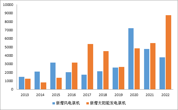 圖9 2013—2022年新增風(fēng)電、太陽能發(fā)電裝機(jī)情況(單位:萬千瓦)