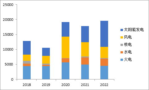 2018、2019兩年新增裝機(jī)規(guī)模連續(xù)下滑。2020年,在水電、風(fēng)電、太陽能發(fā)電裝機(jī)高速增長的帶動下,新增裝機(jī)容量大幅提升。2021年受火電、風(fēng)電新增裝機(jī)容量減少的影響,整體新增規(guī)模同比出現(xiàn)下滑。2022年,在火電、核電、風(fēng)電新增裝機(jī)增速負(fù)增長情況下,太陽能發(fā)電新增裝機(jī)容量增速達(dá)約60%,拉高全年新增裝機(jī)增速。