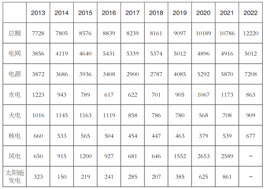 表8 2013—2022年全國電力投資情況(單位:億元)