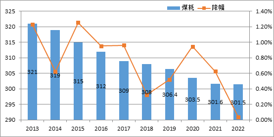 圖19 2013—2022年供電煤耗和降幅(單位:克/千瓦時)