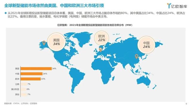 電能儲能包含機(jī)械、化學(xué)及電磁等眾多技術(shù)路線,抽水蓄能仍是主要儲能方式,美國、中國和歐洲依然引領(lǐng)全球新型儲能市場。
