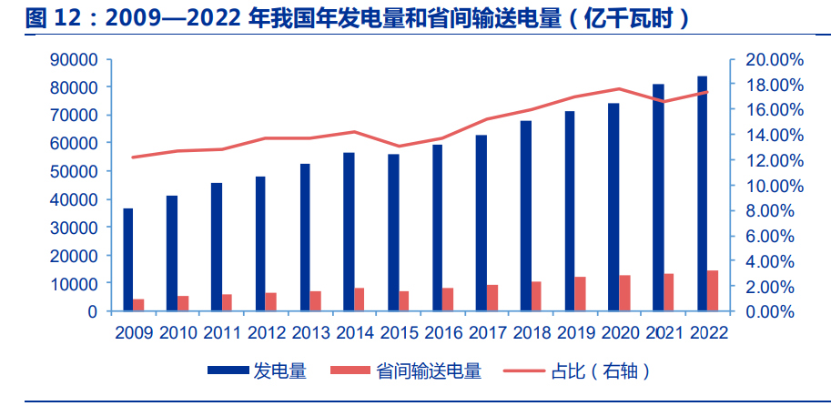 前面提到,由于歷史沿革原因,我國大陸地區(qū)除內(nèi)蒙古和河北外,每個省級行政區(qū)均 設(shè)有 1 個省級電網(wǎng),加上內(nèi)蒙古自治區(qū)的蒙東、蒙西和河北的冀北、河北南網(wǎng) 4 個省級電 網(wǎng),共有 33 個省級電網(wǎng),大部分電力的生產(chǎn)和消納均在省內(nèi)完成。我國跨省輸電電量穩(wěn)步 提升,從 2009 年的 4459 億千瓦時上升至 2022 年的 14610 億千瓦時,增加約 3 倍,占 比也從 12.2%提升到 17.4%,2022 年全年發(fā)電量約 8.4 萬億千瓦時。