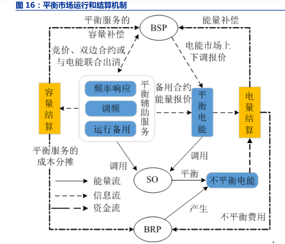 歐洲的平衡市場源于 2017 年 12 月 23 日歐盟委員會 EB 條例,該條例給出一個指導 方針,使得各國可以在平衡市場中共享資源,從而使發(fā)電量始終與用電量相等。從實際達 成的效果來看,歐洲平衡市場與我國的調(diào)頻輔助服務(wù)類似。 在平衡市場中,調(diào)度智能歸于 TSO 或者 DSO,參與平衡市場運行和結(jié)算的市場成員 包括 BSP(BalanceServiceProvider,BSP)和 BRP(BalanceResponsibilityParty,BRP) 等。其中 BSP 提供平衡資源,在實際運行中根據(jù)系統(tǒng)頻率變化或調(diào)度指令改變自身出力以 幫助系統(tǒng)恢復(fù)平衡,BRP 是承擔責任并參與不平衡結(jié)算的市場成員。