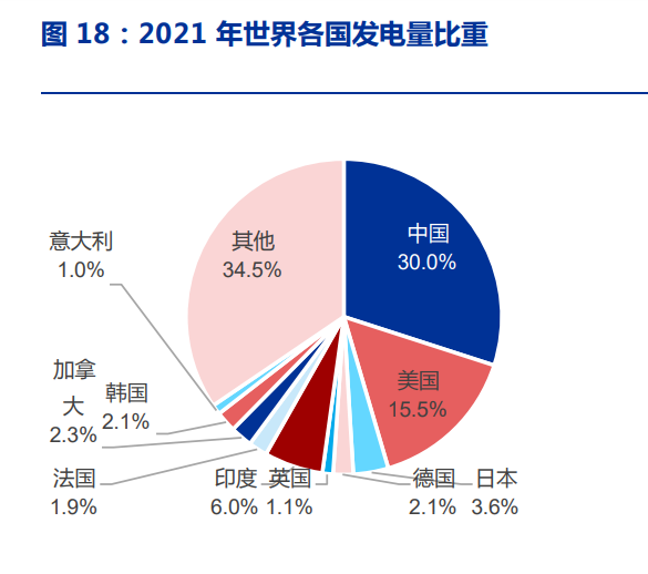 我國面臨著人類歷史上最為艱巨的新能源轉型之路。中國如今已經(jīng)擁有全世界最大的 電力系統(tǒng),2021 年我國發(fā)電量占全球比例已達到 30%,接近第二名美國的 2 倍,更重要 的是我國的用電規(guī)模仍在快速增長,2021 年我國全年新增發(fā)電量達 7552 億千瓦時(BP 口徑),是德國 2021 年全國用電量的接近 1.3 倍,而德國總發(fā)電量從近 20 年基本維持在 穩(wěn)定水平。
