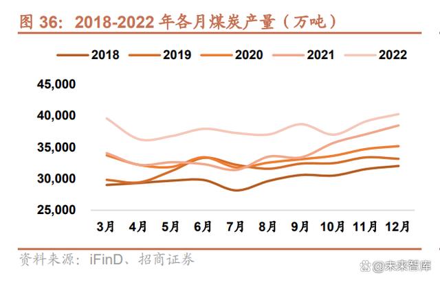 在保供政策的支持下,2022 年國內煤炭供應在進口煤炭價格暴漲的情況下基本維持穩(wěn)定。2022 年,全國煤炭產量 45.6 億噸,同比增長 10.6%,比去年增加 4.4 億噸,創(chuàng)歷史新高。2022 年各個月煤炭產量在近五年均為最高。進口 煤炭 2.93 億噸,同比增長 43.34%,其中 8-12 月份煤炭進口量遠高于往年同期水平。庫存方面,2022 年全國煤炭庫 存由 1 月的 1945 萬噸增長到年末的 2057 萬噸,增長 5.7%。港口庫存上,秦皇島港、黃驊港煤炭庫存 2022 年內均 有上升,其中秦皇島港年內最高庫存達到 592 萬噸,相較于年初增長 31.8%。內陸省份上,東北、華東、西南、西北 煤炭庫存在年內均有上漲,六大發(fā)電集團(國家電投、華能集團、國家能源集團、華電集團、大唐集團、三峽集團) 煤炭庫存在年末達到 1206.8 萬噸,較年初增長 3.8%。