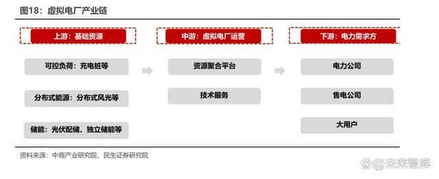 虛擬電廠產(chǎn)業(yè)鏈包括:上游基礎(chǔ)資源、中游虛擬電廠運(yùn)營、下游電力需求方。 上游基礎(chǔ)資源由可控負(fù)荷、分布式能源與儲能構(gòu)成;中游是提供運(yùn)營服務(wù)與技術(shù)支 持的虛擬電廠運(yùn)營平臺;下游則由電力公司、售電公司、工業(yè)企業(yè)、商業(yè)用戶等電 力需求方構(gòu)成。