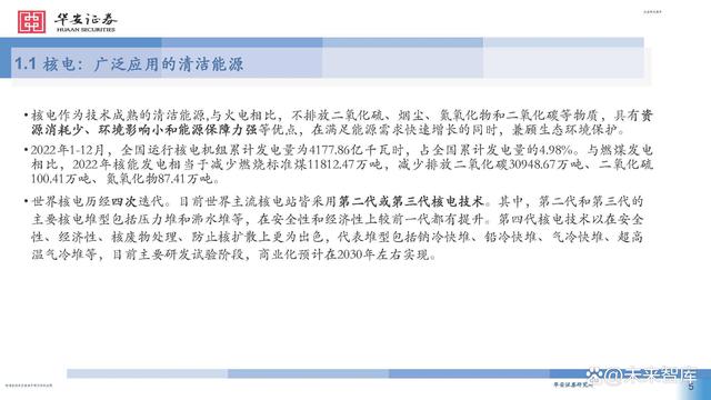 2022年1-12月,全國運行核電機組累計發(fā)電量為4177.86億千瓦時,占全國累計發(fā)電量的4.98%。與燃煤發(fā)電 相比,2022年核能發(fā)電相當于減少燃燒標準煤11812.47萬噸,減少排放二氧化碳30948.67萬噸、二氧化硫 100.41萬噸、氮氧化物87.41萬噸。 世界核電歷經四次迭代。