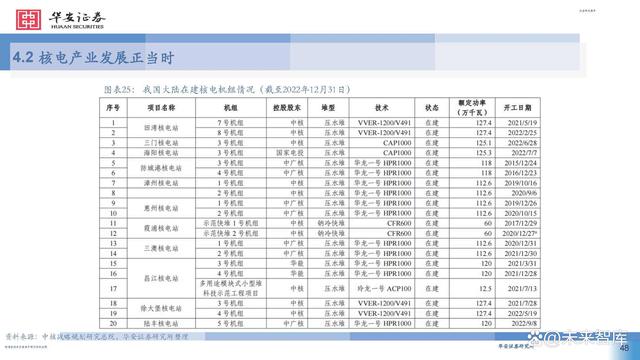 2016~2020年,美國西屋的AP1000和法國電力集團的 EPR三代核電技術全球首堆先后在我國成功建成投產。 我國在過去近40年中,成為全球唯一一個從沒有中斷核 電項目建設的國家,且掌握了建造世界主流核電機型的 能力,施工能力卓越,對于核電項目的建設有先進管理 理念和豐富的經驗,對核電工期具備強有力的掌控能力。