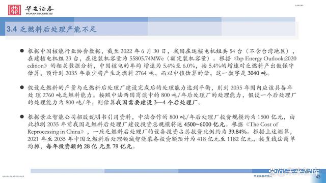 根據中國核能行業(yè)協(xié)會數(shù)據,截至 2022 年 6 月 30 日,我國在運核電機組共 54 臺(不含臺灣地區(qū)), 在建核電機組 23 臺,在運裝機容量為 55805.74MWe(額定裝機容量)。根據《bp Energy Outlook:2020 edition》的相關數(shù)據分析,中國核電的年均 增速為 5.4%至 6.0%,按 5.4%的增速對乏燃料產出做保守 估算,預計到 2035 年最少將產生乏燃料 2764 噸,而以中值估算的話,這一數(shù)字是 3040 噸。