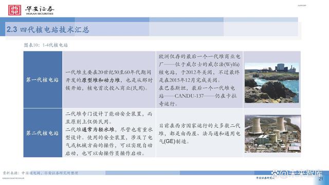 目前世界主流核電站皆采用第二代或第三代核電技術。其中,第二代和第三代的 主要核電堆型包括壓力堆和沸水堆等,在安全性和經濟性上較前一代都有提升。第四代核電技術以在安全 性、經濟性、核廢物處理、防止核擴散上更為出色,代表堆型包括鈉冷快堆、鉛冷快堆、氣冷快堆、超高 溫氣冷堆等,目前主要研發(fā)試驗階段,商業(yè)化預計在2030年左右實現(xiàn)。