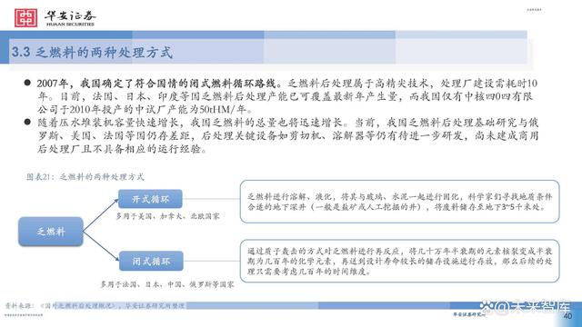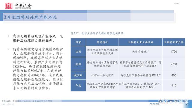 2007年,我國確定了符合國情的閉式燃料循環(huán)路線。乏燃料后處理屬于高精尖技術,處理廠建設需耗時10 年。目前,法國、日本、印度等國乏燃料后處理產能已可覆蓋最新年產生量,而我國僅有中核四0四有限 公司于2010年投產的中試廠產能為50tHM/年。 隨著壓水堆裝機容量快速增長,我國乏燃料的總量也將迅速增長。當前,我國乏燃料后處理基礎研究與俄 羅斯、美國、法國等國仍存差距,后處理關鍵設備如剪切機、溶解器等仍有待進一步研發(fā),尚未建成商用 后處理廠且不具備相應的運行經驗。