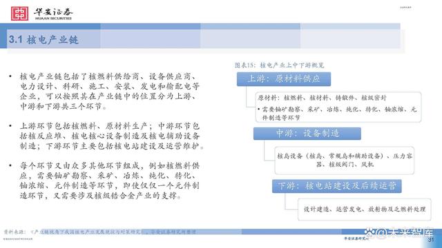 核電產業(yè)鏈包括了核燃料供給商、設備供應商、 電力設計、科研、施工、安裝、發(fā)電和輸配電等 企業(yè),可以按照其在產業(yè)鏈中的位置分為上游、 中游和下游共三個環(huán)節(jié)。 上游環(huán)節(jié)包括核燃料、原材料生產;中游環(huán)節(jié)包 括核反應堆、核電核心設備制造及核電輔助設備 制造;下游環(huán)節(jié)主要包括核電站建設及運營維護。 每個環(huán)節(jié)又由眾多其他環(huán)節(jié)組成,例如核燃料供 應,需要鈾礦勘察、采礦、冶煉、純化、轉化、 鈾濃縮、元件制造等環(huán)節(jié),即使僅僅一個元件制 造環(huán)節(jié),又需要涉及核級鋯合金產業(yè)的支撐。
