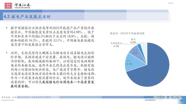 據中國核能行業(yè)協(xié)會發(fā)布的2022年能源產品產量統(tǒng)計數(shù) 據顯示,中國核能發(fā)電量僅占總發(fā)電量的4.98% ,低于 中亞和東亞平均值6.3%相比于北美的 18.8% ,北歐、西 歐和南歐的 24.2% ,東歐的 22.1% ,中國核電在低碳政 策背景下的發(fā)展?jié)摿Ψ浅4蟆?此外,無論是國內大規(guī)模上馬核電項目還是核電走向國 際市場,其經濟效益十分顯著。在國內,核電項目被稱 為印鈔機,在雙碳減排的驅動下,以前還受到電網調峰 要求的各核電站,近兩年來已經是應發(fā)盡發(fā),機組有效 利用小時數(shù)紛紛創(chuàng)出新高,電廠效益節(jié)節(jié)攀升。核電項 目投資也受到各地方政府和各大銀行的大力支持和追捧。 作為一個政策導向型顯著的行業(yè),近年來迎來了密集的 政策利好,可以預見我國核電行業(yè)將迎來一個高質量發(fā) 展的黃金期。