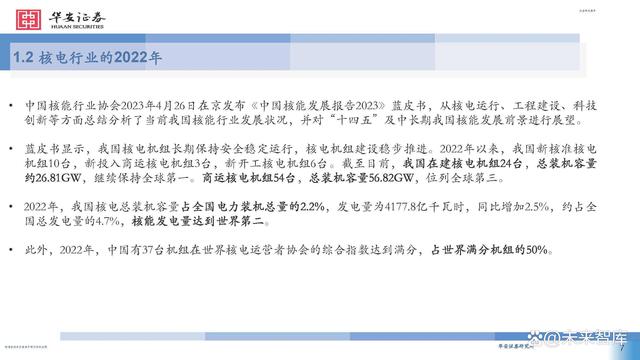 中國核能行業(yè)協(xié)會2023年4月26日在京發(fā)布《中國核能發(fā)展報告2023》藍皮書,從核電運行、工程建設、科技 創(chuàng)新等方面總結分析了當前我國核能行業(yè)發(fā)展狀況,并對“十四五”及中長期我國核能發(fā)展前景進行展望。藍皮書顯示,我國核電機組長期保持安全穩(wěn)定運行,核電機組建設穩(wěn)步推進。2022年以來,我國新核準核電 機組10臺,新投入商運核電機組3臺,新開工核電機組6臺。截至目前,我國在建核電機組24臺,總裝機容量 約26.81GW,繼續(xù)保持全球第一。商運核電機組54臺,總裝機容量56.82GW,位列全球第三。 2022年,我國核電總裝機容量占全國電力裝機總量的2.2%,發(fā)電量為4177.8億千瓦時,同比增加2.5%,約占全國總發(fā)電量的4.7%,核能發(fā)電量達到世界第二。 此外,2022年,中國有37臺機組在世界核電運營者協(xié)會的綜合指數(shù)達到滿分,占世界滿分機組的50%。
