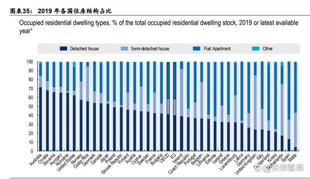 遠期空間:美國房屋結(jié)構(gòu)具有天然優(yōu)勢,戶儲可利用屋頂面積高。戶用光伏和儲能設(shè)備通 常被安裝在家庭住房的屋頂上。因此,住房的類型、屋頂?shù)拿娣e大小等也直接決定了戶儲 的安裝難度和長期安裝需求,相對來說,獨立住房比高層樓房單戶房頂面積多,能夠安裝 更多戶儲,結(jié)構(gòu)也更適合當前的分布式戶儲設(shè)備。根據(jù) OECD,美國 2019 年獨立住房和半 獨立住房的占比接近 70%,在統(tǒng)計的多個國家中排行第 6 名。根據(jù)美國經(jīng)濟分析局,2022 年美國人口 3.34 億,我們保守估計獨棟住房 6000 萬套,按 10%的滲透率、平均每戶 10kWh 計算,戶儲容量約為 600GWh,戶儲市場遠期想象空間大。