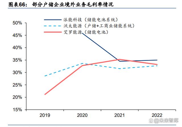 對比成熟的家電行業(yè):我們選取發(fā)展相對比較成熟的家電行業(yè)進行對比,家電企業(yè)做境外 業(yè)務(wù)主要有出口自有品牌、海外并購、ODM/OBM/OEM 代工三種模式。我們通過對比發(fā)現(xiàn), 選擇自有品牌模式的樂歌股份、安克創(chuàng)新、石頭科技、星徽股份能夠在境外獲得更高的毛 利率,我們計算四家企業(yè) 2018-2022 年境外與境內(nèi)的毛利率差值均值為 10.65pct。同時, 由于能夠選擇以自有品牌打海外市場的公司產(chǎn)品具有較強的產(chǎn)品力,其整體毛利率通常也 處于較高水平。戶儲產(chǎn)品在一定程度上具有家電屬性,國內(nèi)儲能產(chǎn)業(yè)鏈發(fā)展國際領(lǐng)先,具 有強產(chǎn)品力與品牌力,隨著后續(xù)行業(yè)競爭加劇,我們認為穩(wěn)態(tài)下戶儲行業(yè)優(yōu)質(zhì)企業(yè)仍能夠 維持高出國內(nèi)市場平均 5 個百分點以上的毛利率水平。