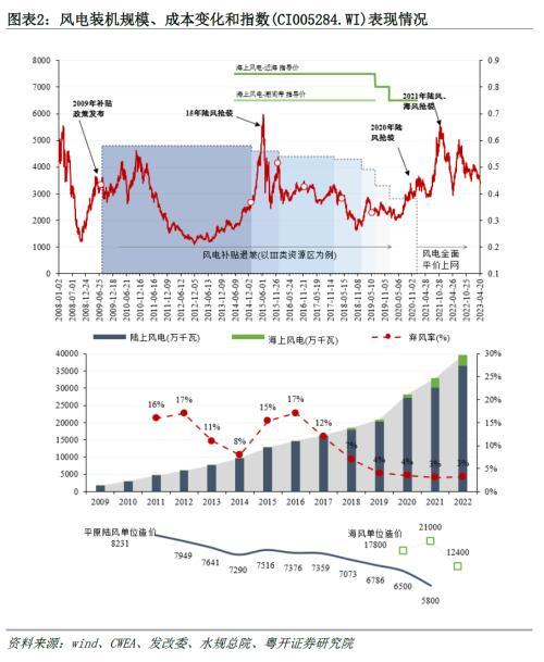 2008年底風(fēng)電指數(shù)底部回升,2010年底指數(shù)見(jiàn)頂,期間補(bǔ)貼政策發(fā)布;2011年后指數(shù)開(kāi)啟下跌,于2012年末見(jiàn)底,期間風(fēng)電遭遇行業(yè)出清和嚴(yán)監(jiān)管;2013年指數(shù)緩慢反彈回升,2015年陸風(fēng)搶裝和市場(chǎng)大熱推動(dòng)指數(shù)快速爬升,至2015年6月見(jiàn)頂;2015年下半年開(kāi)始,指數(shù)震蕩下跌,并于2018年10月觸底反彈;2020和2021年連續(xù)兩年的搶裝使得風(fēng)電指數(shù)創(chuàng)新高,2021年11月指數(shù)見(jiàn)頂,雖在2022年有階段性行情表現(xiàn),但整體波動(dòng)式下跌。