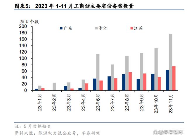 多因素推動(dòng),23 年高增趨勢初現(xiàn)。根據(jù)能源電力說公眾號(hào)的不完全統(tǒng)計(jì),僅 2023 年 7-11 月,國內(nèi)工商業(yè)儲(chǔ)能備案項(xiàng)目個(gè)數(shù)達(dá) 1305 個(gè)。從工商業(yè)分布較為集中的廣東、浙江、江蘇 三個(gè)省份來看,月度備案項(xiàng)目數(shù)量均呈現(xiàn)大幅上升趨勢。據(jù)不完全統(tǒng)計(jì),2023 年以來我國 工商業(yè)儲(chǔ)能備案規(guī)模已經(jīng)達(dá)到 3.46GW/9.26GWh。工商業(yè)儲(chǔ)能高速增長的勢頭已經(jīng)初步顯 現(xiàn),2023 年成為國內(nèi)工商儲(chǔ)的放量元年。