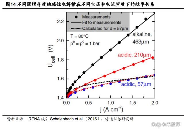 減小隔膜厚度:可以提高效率并減少電力消耗。隔膜越薄,將 OH-從陰極運(yùn)輸 到陽(yáng)極的阻力就越低,但由于氣體滲透水平較高,從而可能導(dǎo)致安全問(wèn)題。另 一個(gè)缺點(diǎn)是耐久性較低,因?yàn)楦裟ぶ懈锌赡軙?huì)形成針孔,導(dǎo)致機(jī)械魯棒性降 低??傮w而言,堿性電解槽的隔膜厚度應(yīng)該接近 PEM 槽和 AEM 槽的水平。對(duì) 于 PEM 來(lái)說(shuō),目前最先進(jìn)的膜厚度為 125-175 μm,并有潛力降低到 20 μm。 ALK 目前的隔膜厚度為 460 μm,將其降低到 50 μm 可以使堿槽在 1A/cm2 下 的效率從 53%提升到 75%。