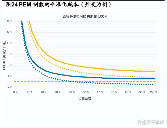 PEM 技術(shù)可通過(guò)為電網(wǎng)提供額外的輔助性服務(wù),以降低成本。由于 PEM 技術(shù)提供 更寬廣的工作范圍并且響應(yīng)時(shí)間更短,可以在不折損其可用生產(chǎn)能力的情況下,提供高 價(jià)值頻率控制備用容量,從而適應(yīng)可再生能源(VRE)的生產(chǎn)波動(dòng)性,為不同的電力市 場(chǎng)提供靈活性服務(wù)獲得收入。這種靈活性可以提高電力制氫的整體經(jīng)濟(jì)效益,推動(dòng) PEM 平準(zhǔn)化成本(LCOH)的降低。以丹麥綠氫生產(chǎn)的 LCOH 為例,連接電網(wǎng)的 PEM 電解 裝臵相較 ALK 基本具備競(jìng)爭(zhēng)力。
