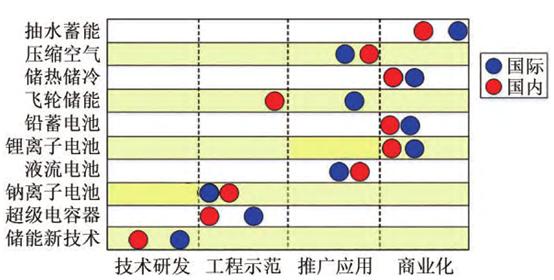 從各類儲能技術(shù)的研發(fā)推廣進(jìn)程看,目前我國儲能技術(shù)基本上與國際先進(jìn)水平并跑,壓縮空氣儲能、儲熱儲冷、鉛蓄電池、鋰離子電池、液流電池和鈉離子電池技術(shù)已達(dá)到或接近世界先進(jìn)水平;抽水蓄能、飛輪儲能、超級電容和儲能新技術(shù)與世界先進(jìn)水平還有一定的差距,如下圖所示。
