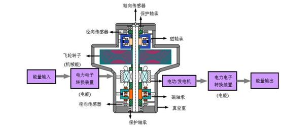 ——工作原理。飛輪儲能的原理是利用過剩電力給真空外殼中的轉(zhuǎn)子(飛輪)加速,把電能以動能的形式儲存。在儲能階段,通過電動機(jī)拖動飛輪,使飛輪本體加速到一定的轉(zhuǎn)速,將電能轉(zhuǎn)化為動能;在能量釋放階段,飛輪的旋轉(zhuǎn)速度會降低,電動機(jī)作發(fā)電機(jī)運(yùn)行,將動能轉(zhuǎn)化為電能。一般來說,飛輪系統(tǒng)使用電流來控制飛輪速度,其中高能的飛輪使用高強(qiáng)度碳纖維制成的轉(zhuǎn)子,并通過磁懸浮軸承實現(xiàn)懸浮。這些轉(zhuǎn)子在真空罩內(nèi)的轉(zhuǎn)速可達(dá)到20000-50000rpm,可以在幾分鐘內(nèi)達(dá)到所需的速度。