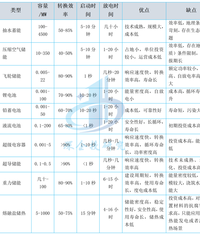 儲能技術(shù)呈現(xiàn)多元化發(fā)展格局,各有不同的應(yīng)用場景。每種儲能技術(shù)均具有一定的獨特性,在實際應(yīng)用中,需要用戶綜合考慮各種儲能技術(shù)的特點以及優(yōu)缺點,選擇最適宜的技術(shù)方案。比如,飛輪儲能、超級電容、超導(dǎo)儲能可以解決秒級或分鐘級以下的調(diào)頻需求;抽水蓄能、壓縮空氣儲能、燃料電池和電化學(xué)儲能等則更適用于進(jìn)行小時級調(diào)峰;氫儲能適合執(zhí)行季節(jié)性調(diào)峰。不同儲能技術(shù)的特點如下表所示。