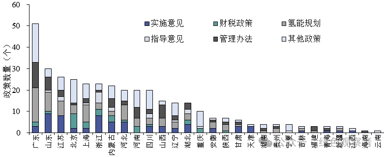 圖3 中國(guó)各省市氫能產(chǎn)業(yè)各領(lǐng)域政策分布資料來源:根據(jù)氫能產(chǎn)業(yè)大數(shù)據(jù)平臺(tái)檢索所得(檢索時(shí)間2023年9月14)。