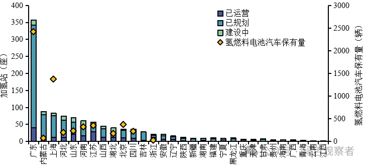 圖2 全國(guó)加氫站及氫燃料電池汽車保有量分布資料來源:根據(jù)氫能產(chǎn)業(yè)大數(shù)據(jù)平臺(tái)檢索所得(檢索時(shí)間2023年9月14)。注:部分省市尚無氫燃料電池汽車,故數(shù)據(jù)為零。