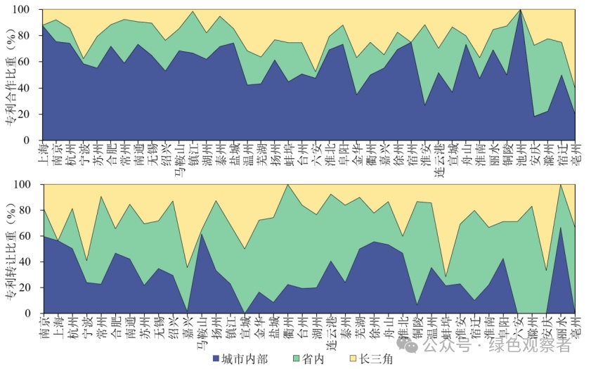 圖4 長(zhǎng)三角不同空間尺度的氫能專利合作及專利轉(zhuǎn)讓占比資料來源:根據(jù)incopat專利數(shù)據(jù)庫(kù)進(jìn)行專利檢索所得。注:部分城市未發(fā)生氫能專利合作及專利轉(zhuǎn)讓事件,故數(shù)據(jù)為零或未體現(xiàn)。